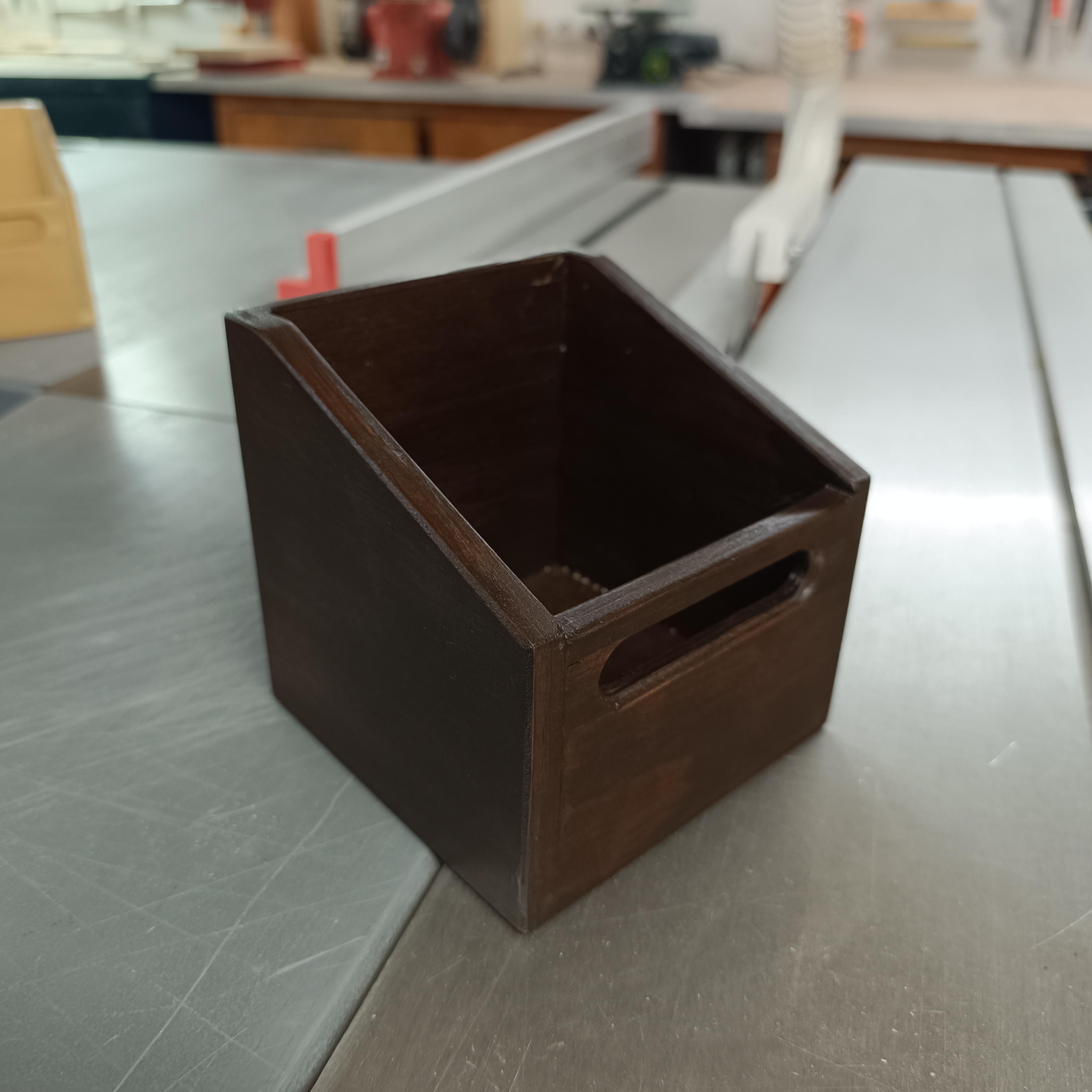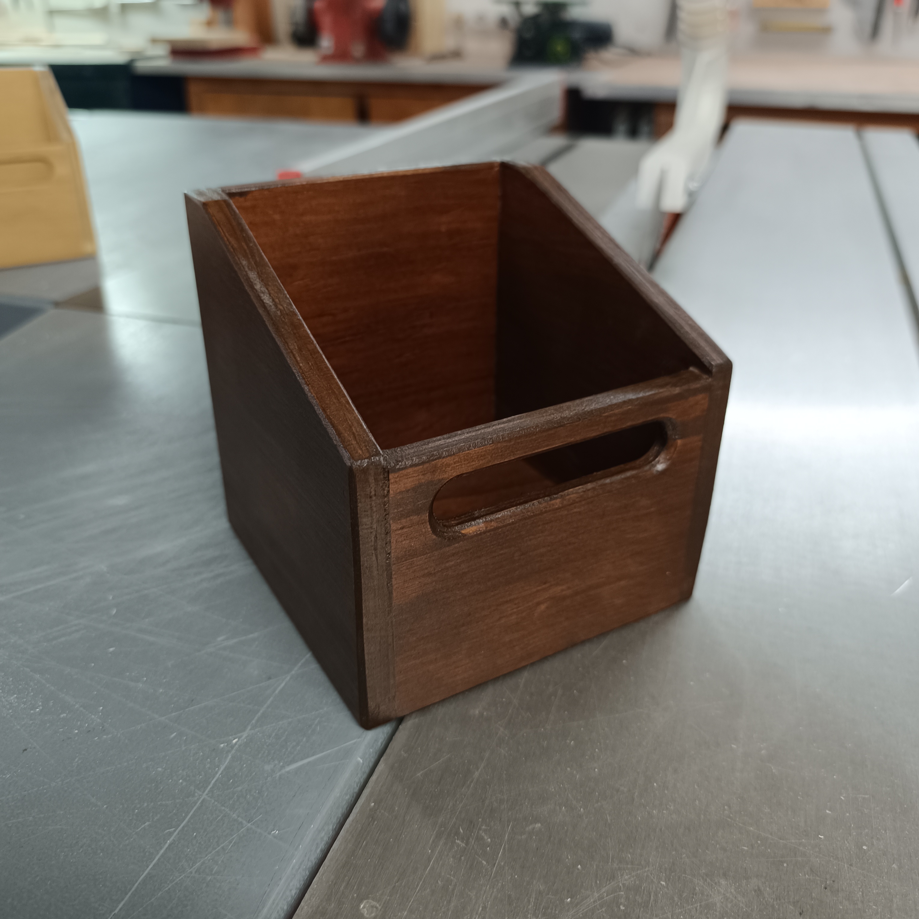 Aceiteras de madera contrachapada de 9mm de grosor, con asa frontal para facilitar el agarre y transporte.