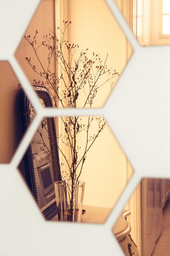 Cada vez se le da más importancia al diseño de los espejos, ahora ya son un elemento decorativo por sí solo, y es por ello que cada vez más estamos viendo diseños más innovadores y atrevidos para los espejos. Atrás quedaron los modelos más típicos de espejos cuadrados, rectangulares o circulares. Ahora se llevan formas geométricas y diseños más atípicos pero muy originales. Son un buen ejemplo los espejos hexagonales. Con ellos también puedes decorar una pared y a la vez proporcionarás amplitud a la habitación.