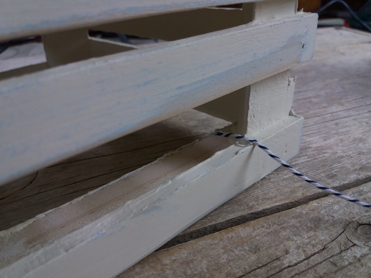 Con la ayuda de una pistola de pegamento caliente decoramos las asas de la caja con un fino cordel en tonos azul y blanco, muy en concordancia con el diseño general. Aplicamos una gota de pegamento para fijar el cordel y lo iremos enrollando lentamente. De vez en cuando recomendamos ir aplicando un poco de pegamento para fijar bien el trabajo que vamos realizando.