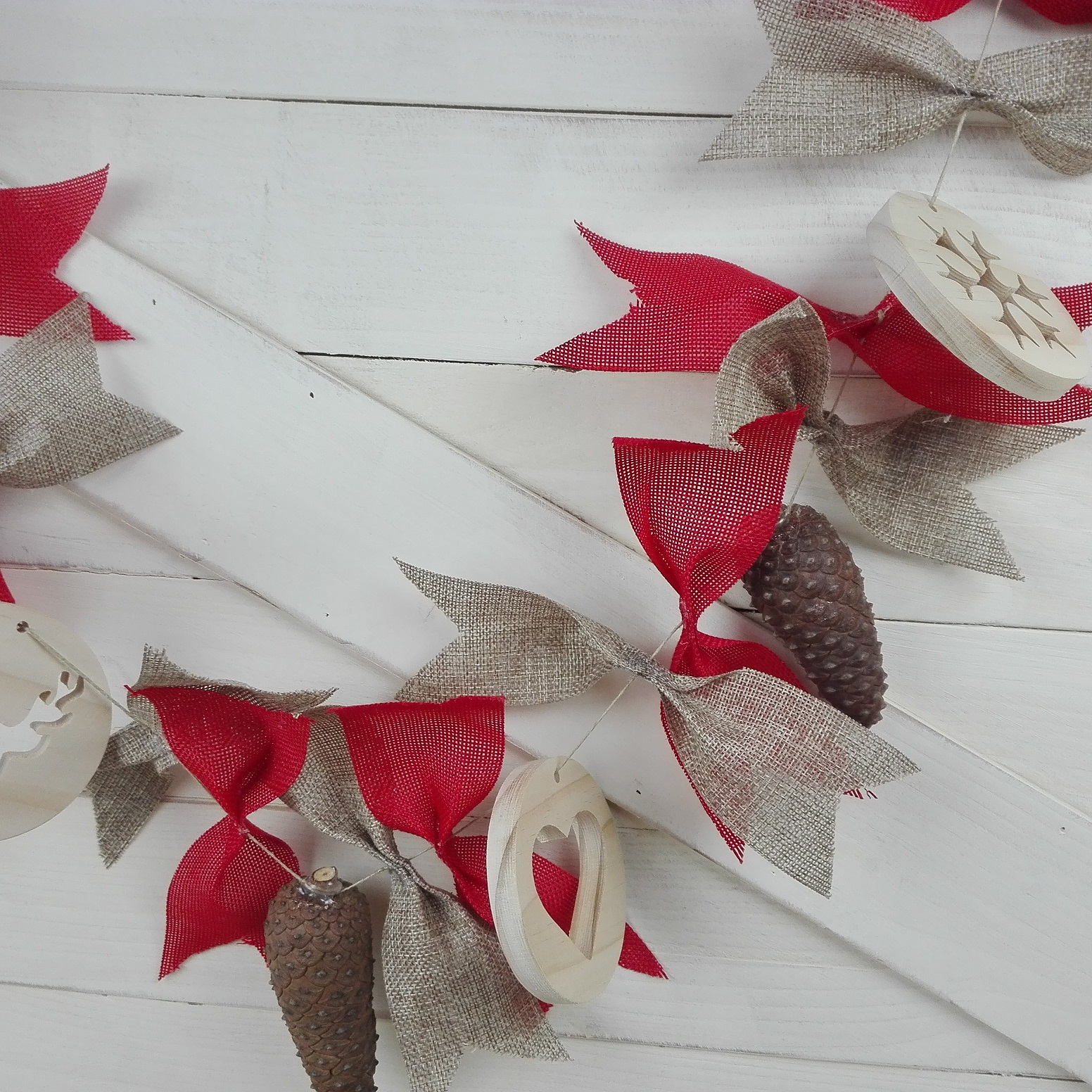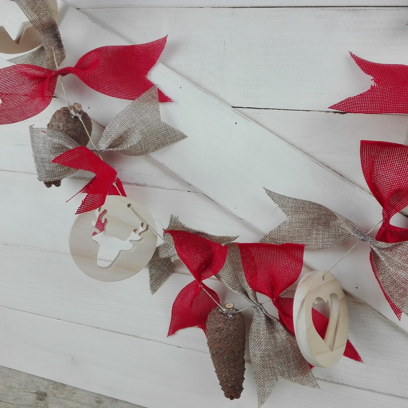 La guirnalda que vamos a hacer en esta entrada es de un diseño más clásico y típico de la festividad. Los adornos que hemos utilizado son los que contienen siluetas navideñas. Nos ha parecido que ambos conceptos encajan a la perfección, ya que de ésta manera los adornos pasan a ser el centro de la guirnalda. Para acompañarlos hemos decidido utilizar piñas naturales y cintas rojas y rústicas. Os aseguramos que la combinación es ideal.