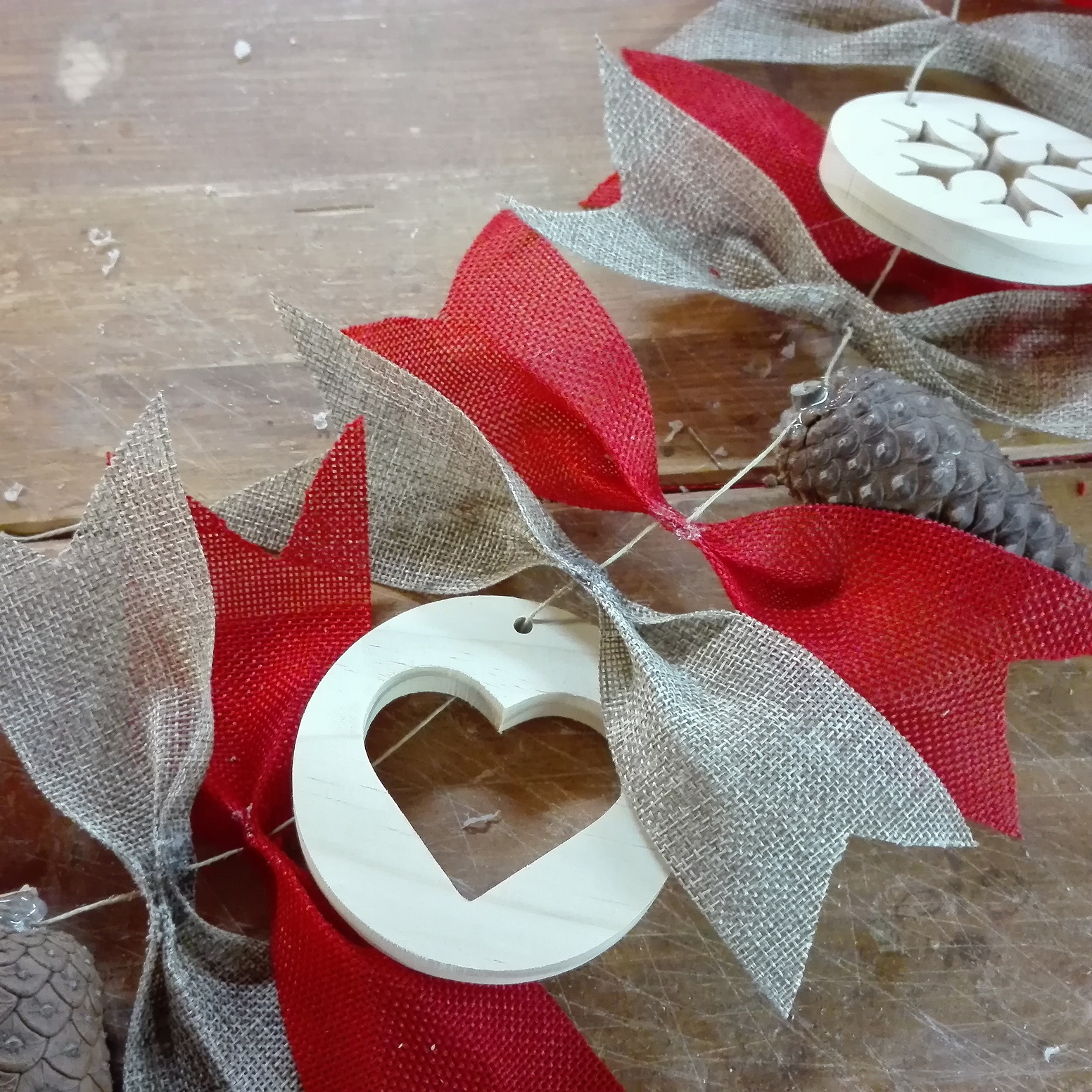 Toca coger el cordón fino y construir la guirnalda. Nosotros primero con la ayuda de una aguja hemos pasado el cordón por el centro de las cintas. Las hemos doblado intentando simular la unión de un lazo, ya que estéticamente queda mejor. También hemos pasado los adornos. Lo único que aún va a quedar libre son las piñas, que las añadiremos un poco más tarde.